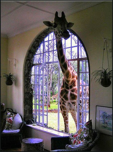 I just thought this was a really cool picture. How nice would it be to wake in the morning and have this beautiful creature checking you out? Talk about close proximity! I'm thinking that this is a resort somewhere, probably Africa. I know it's not in the US because Animal Kingdom Lodge Resort is the only place in North America with giraffes on site. And I used to work there!