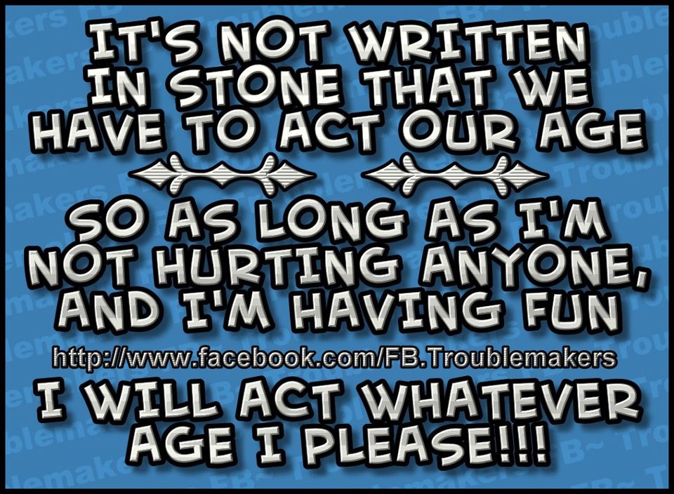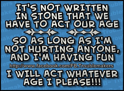 This made me think of the time my mom told me to grow up and act my age. I think I was around thirty something and at the time it hurt my feelings. I've always been a jokester and yes, there are times I don't act my age. But darn it, I enjoy life, and have fun and that's all that matters! Isn't it? My body may be going on 57 but my mind is still hoovering somewhere around thirty:)