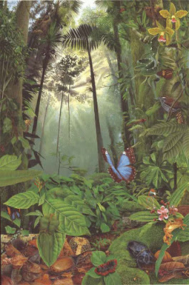More than two thirds of the world's plant species are found in the tropical rainforests: plants that provide shelter and food for rainforest animals as well as taking part in the gas exchanges which provide much of the world's oxygen supply. Rainforest plants live in a warm humid environment that allows an enormous variation rare in more temperate climates: some like the orchids have beautiful flowers adapted to attract the profusion of forest insects. Competition at ground level for light and food has lead to evolution of plants which live on the branches of other plants, or even strangle large trees to fight for survival. The aerial plants often gather nourishment from the air itself using so-called "air roots". The humidity of the rainforest encourages such adaptations which would be impossible in most temperate forests with their much drier conditions.