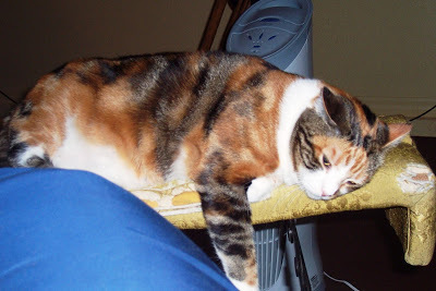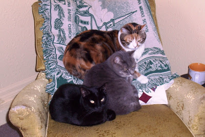Okay, don't laugh at my old 1940's rocker. It's perfect for me and I love it. I just wanted to show you what my feline family does the minute I walk out of the room. GinGin, the calico is so heavy that the back of the chair goes back in the reclining position when she's on it. They love my chair, too. So I can't get rid of it. They won't move until I turn and lower my butt toward them:)