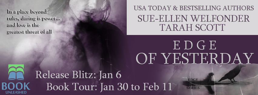 USA Today and Internationally bestselling authors Sue-Ellen Welfonder and Tarah Scott have more in common than friendship. For many years, they’ve both enjoyed spending their working hours in a world of romance and adventure, bringing handsome Highlanders and their ladies to life. Now they’ve joined pens, deciding that when it comes to happily-ever-afters, two writers can stir up even more danger and desire for the characters they love. The EDGE series, Scottish time travel romances, is their first co-authored project, and launches Dec. 27th with EDGE OF YESTERDAY.