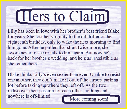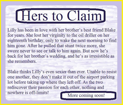 Hers to Claim will be available on 10/1 folks! I should get the cover any day now. It's a short erotic romance that was previously released with Ellora's Cave. With a brand new cover and added content, I can't wait to release it.