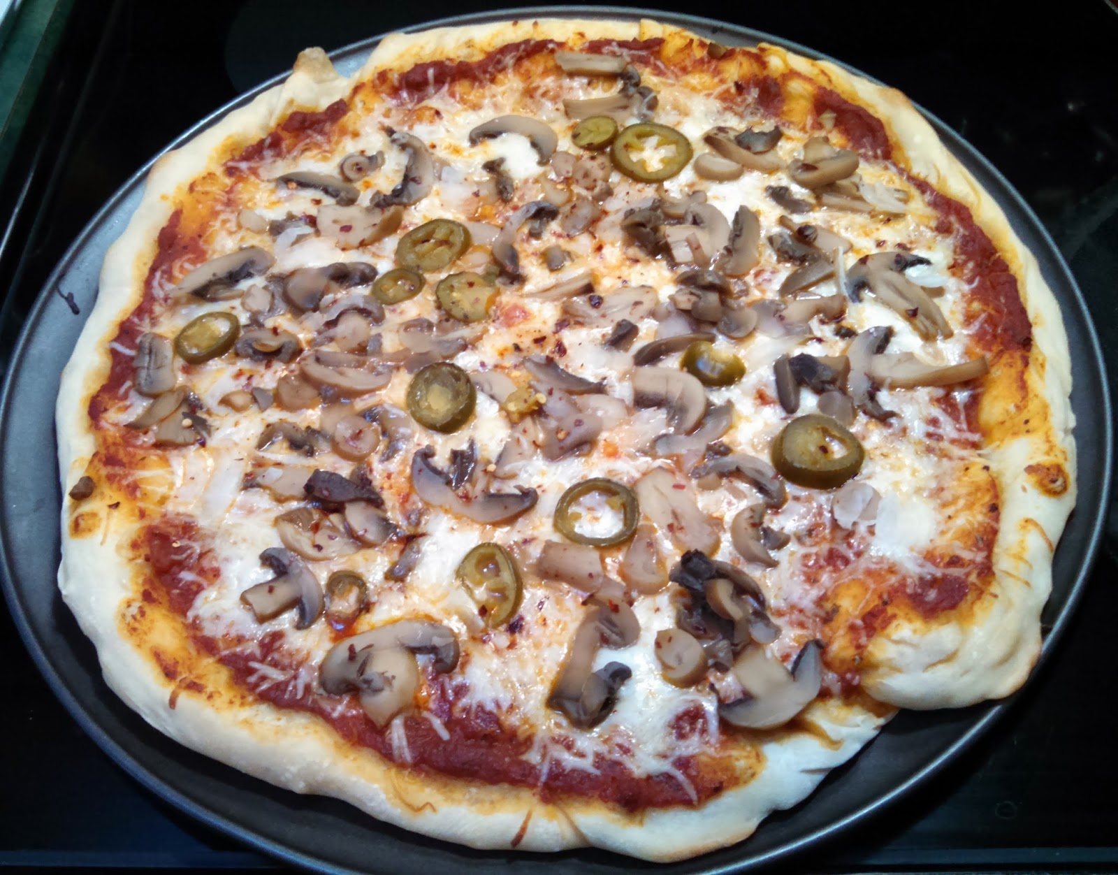 Sometimes I experiment with ingredients just because it sounds like it would be good in my mind. I love spicy! So the other day I decided to make a spicy pizza from scratch. It came out so tasty that I thought I'd share my recipe with you. It was easy to make. I greased the pizza pan with olive oil, then used some fresh bread dough that I bought at my local grocery store bakery. Spread a light layer of spaghetti sauce over that, then added a package of mozzarella cheese. Topped it off with two cans of mushrooms, thinly sliced onion, crushed red pepper and jalapeno peppers. Baked it on 400 for about 25 minutes.