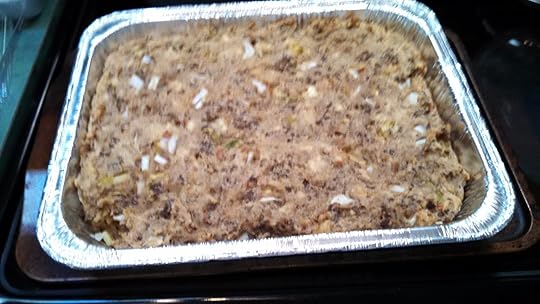 Every year my daughter's co-workers ask for a pan of my homemade dressing for their holiday party. This is what it looks like. I think it tastes better from inside the turkey but they must like it if they request it every year. Below is the recipe.To stuff a 13-15 pound turkey