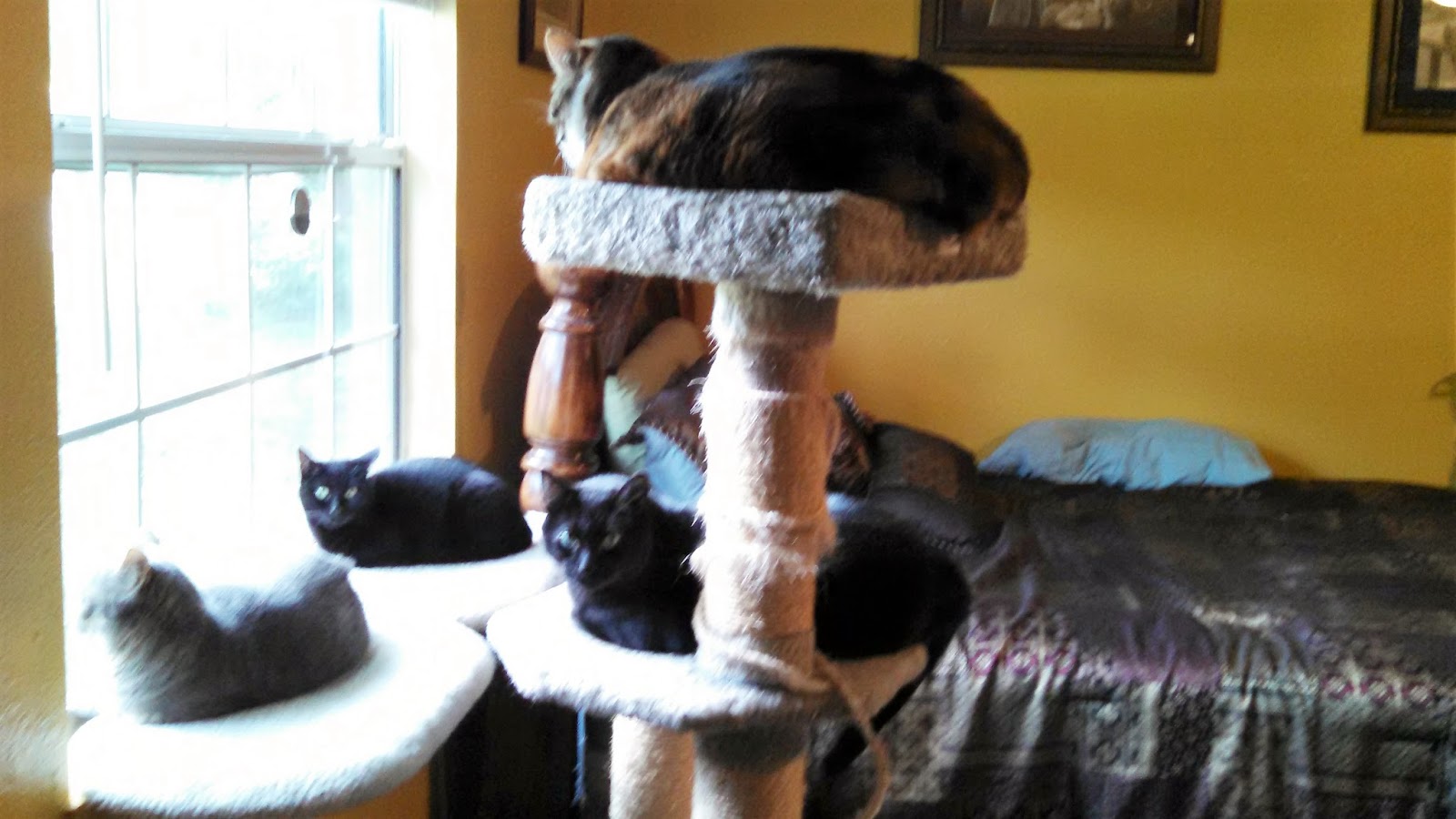 Woofy - gray tabbyJezzie - little black cat next to himGin Gin - calico on the topBear Cat - black cat beneath Gin Gin