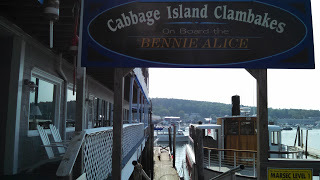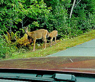 The day after I arrived home we took a scenic boat ride over to Cabbage Island for the clambake. We were met with a two lobster meal that included steamed clams, fish chowder, baked potato, onion, and a huge piece of blueberry cake. Spent one full day further up north from where my cousin lives, driving around looking for moose. Didn't see any but I did get a shot of a doe and her baby.