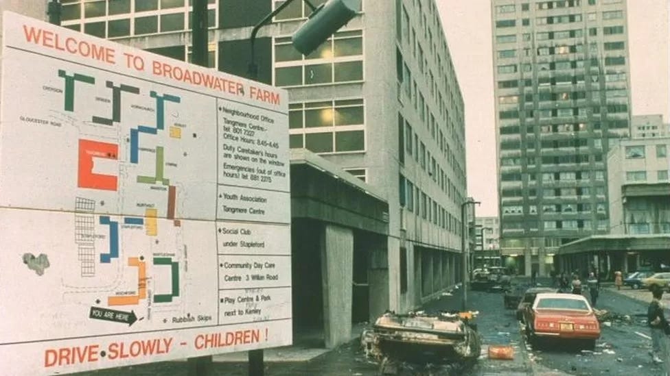 Though Broadwater wasn’t the catalyst, by the end of 1985 there had been similar eruptions across London and the UK. Brixton, Peckham, Liverpool, Birmingham. Yes, these rebellions were primarily a response to racist police violence and intimidation. Yes, police and state violence is often the most unmistakable and pointed manifestation of racism. A government inquiry explicitly insisted that policing, not housing, was at the root of the uprising. But we would be careless to dismiss the role that the more quotidian instances play in compounding the experiences of racialization and oppression. The contours of daily life, lived in constant reminder that this country will always view you as “less than.” These unavoidably tie in with heavy-handed policing, always the sharpest edge of contemporary racism.