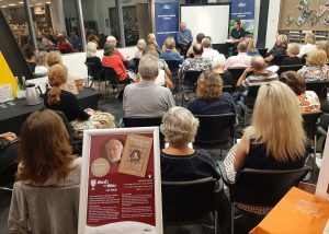 A couple of evenings ago it was my turn (once again) to have a novel launched in that congenial setting. It was part of the Library’s “Words with Wine” series. A large audience listened to local history librarian Anthony Styan interview me about The Madwoman’s Coat, my fifth work of historical fiction. His subtle and stimulating questions ensured that our conversation flowed well. Afterwards a good number of attendees lined up to buy copies of my book.