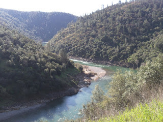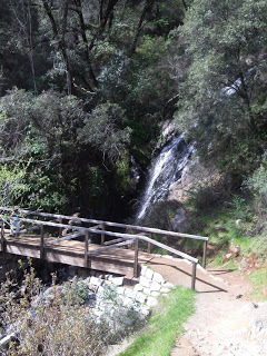 While there was still coolness in the morning air I set off from the stadium gate at Stadium Way and headed up Finley Street. Following Marvin Way and Robie Drive I descended to the Robie Point trail-head. With clear skies, and the early morning sun rising over the hilltops to the east I continued on running the wide Western States Terrace trails that switched back and forth into the canyon. The trail narrowed, and became much steeper after leaving the terrace. A rainy winter had the creeks and rivers filled. I ran on tree shrouded, muddy trails, pock marked with horse hooves, for the next 1/2 mile, descending into the canyon. Before long, I was back into the sun. I could see the North Fork American River below. I knew that No Hands bridge crossed this somewhere ahead, so I ran along with confidence, passing a waterfall on narrow wooden bridge. It was so beautiful, I had to stop and take a photo.