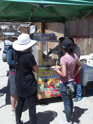 As volunteers we were given privileges. A big bonus was being able to eat from the Hollywood catering food truck. Freshly prepared salads and hot meals twice a day helped to get us through the long days. I especially liked 'Taco Tuesdays' when beef burritos were served. During the final days of the shoot in Santa Clarita it became very hot. Thankfully someone arranged to have natural frozen fruit Popsicle, and a freshly cut fruit, vendors stop by. As talent we felt appreciated.