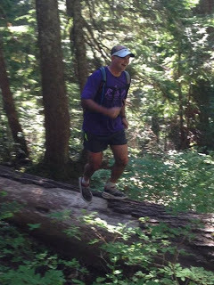 On the far side of the clearing I met up with some runners headed in the opposite direction. We exchanged greetings. I noticed one of them had a two way radio strapped onto their camel pack. I had to be careful on the switchbacks beyond this as I crossed over several creeks balancing on rocks so I wouldn't get a my shoes soaked.