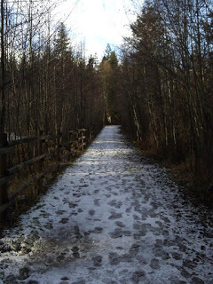 When I turned around to take another photo of the trail ahead, I spotted a black bear, not too far off. It was eating ripe black berries from the bushes at the side of the logging road. I took a shot of it too, and then, quietly, I backed away, moving down the steep hill I had just run up, thinking, "If I hadn't stopped to take that photo I would've had a close encounter with a black bear."