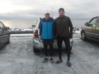 Near 5 a.m. I set off running alone from my self-serve aid station at Point Holmes, heading west along a coastal trail that wound along beside the beach. Snow fell, flashing in front of me in the brightness of the head-lamp. Heading up the edge of Lazo Road, I could see ahead about 4-5 metres, and dropped back the pace when I encountered black ice. Once onto the sidewalks on Guthrie Road I was out of the woods and had much better visibility. There were some good climbs coming up Guthrie and Pritchard Roads that took some work. At the top I was encouraged by the thought that when I switched directions for my next loop after my aid station I would be coming down the same hills. I had to take things cautiously in the dark on Knight Road as there were long sections of black ice and uneven patches of snow on its shoulders.