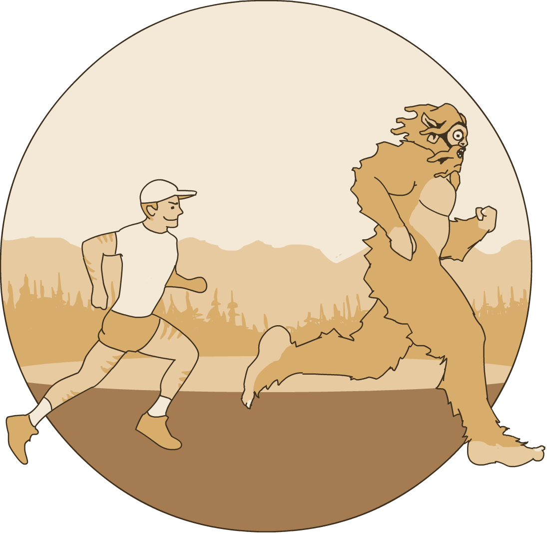 For weeks as I ran this route solo I had the feeling I was being watched, and a couple of times I heard footsteps and deep breathing behind me, but in the few seconds it would take me to stop, and turn to look back, whoever was following me would disappear into the thick underbrush. I gained my pursuer's trust one day by offering him bites of Cliff energy bars I had stashed in my Camel Pack, luring him into the open. Amazingly, it turned out to be a Sasquatch. He was able to communicate with simple grunts and rudimentary sign language. I gave him a Power Bar gel, but he didn't seem to like the taste. After taking a few sips he made a face, and tossed it to the ground, stomping on it with his big foot.