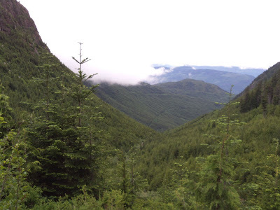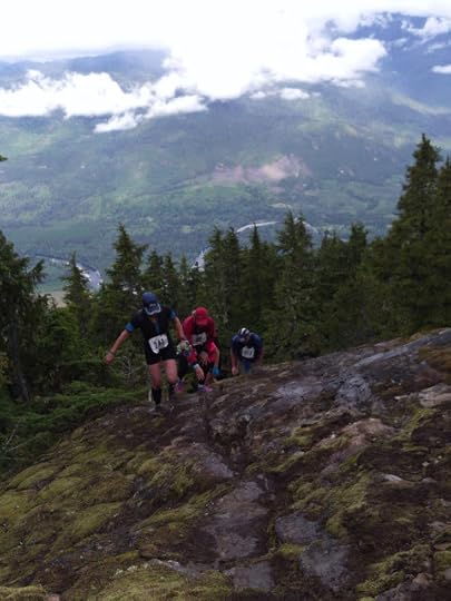As we climbed to the summit, above the clouds, I saw the exposed rock of the peaks for the first time. Other years when I had reached this section in the trail it was still covered in snow. The backside of the mountain was snow-less as well. Because of this descending the "cliff's of insanity" sections with the long ropes took longer than other years, since there was no way to slide by the lines (unless you wanted to get scrapped with rocks and stones). I slipped on a slimy stone as I jumped across a creek in the swampy sections of the lower back forest. It sent a cutting pain across my right calf muscle, and for several seconds of pain I thought I was finished. I slowly moved ahead, and was able to walk it off. Thirty seconds later I was back to running again, and entered the wider, exposed trail, on the switch-backs leading down to aid station three (where Nanaimo bars and Gatorade were waiting for me).