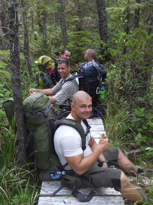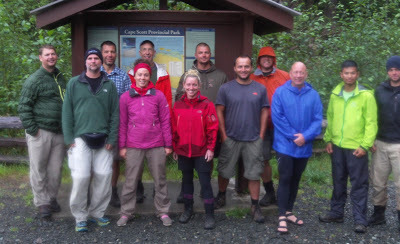 Hauling backpacks, we disembarked from a water taxi at the North Coast Trail head at Shushartie Bay, July 31st around 2 p.m.. Twelve members of 407 Squadron, including, Cpl Caron, MCpl Horwood, MCpl Larouche, Sgt Nadeau, MCpl Proulx, Cpl Smith, Maj Smith, Cpl St-Pierre, 2Lt Tang, Sgt Toth, Cpl Ward, and myself, started off with a great sense of excitement. It was diminished a bit when we found we immediately had a ten metre steep climb by rope into the rain forest.