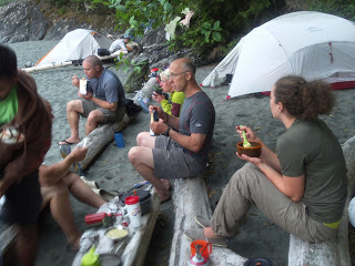 The first night we camped at Skinner Creek I accidentally burned three of my toes with boiling hot water. The next day, while crossing Cape Sutil, I was stung by four mud wasps within five seconds. Even though I cried out for those ahead of me to “Run!!” it did no good because we were hiking a difficult uphill in close ranks. Later that day I slid down a slimy cliff scraping my elbow. The North Coast Trail was becoming somewhat more of a “trial” to endure than a “trail” to trek. But we all persevered, and by day three we were hiking scenic long stretches of sandy, and pebble stone beaches. For about an hour we were followed by a humpback whale a few hundred metres off shore. The whale would rise to the ocean’s surface and release a blasting spout of mist into the air every few minutes.