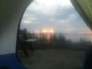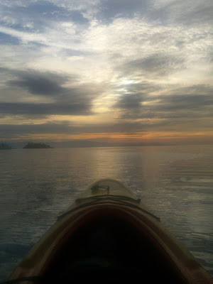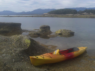 August 26th, a day after the e-book release of my latest book, "Raptured", I left for an overnight kayaking trip on the east coast of Vancouver Island. My goal was to kayak from Deep Bay and circumnavigate Hornby Island, a paddle that would turn out to be thirty seven kilometers. I prayed for good weather as I climbed into my sleeping bag at Deep Bay Resort, where I was camping, so I could get an early start.Waking up at 5:00 a.m., through the tent's entrance I could see the rising sun breaking through the clouds on the horizon. I ate a quick breakfast of muesli and coffee, and then waded into the shallow surf with my kayak and some supplies, just after the tide had turned.