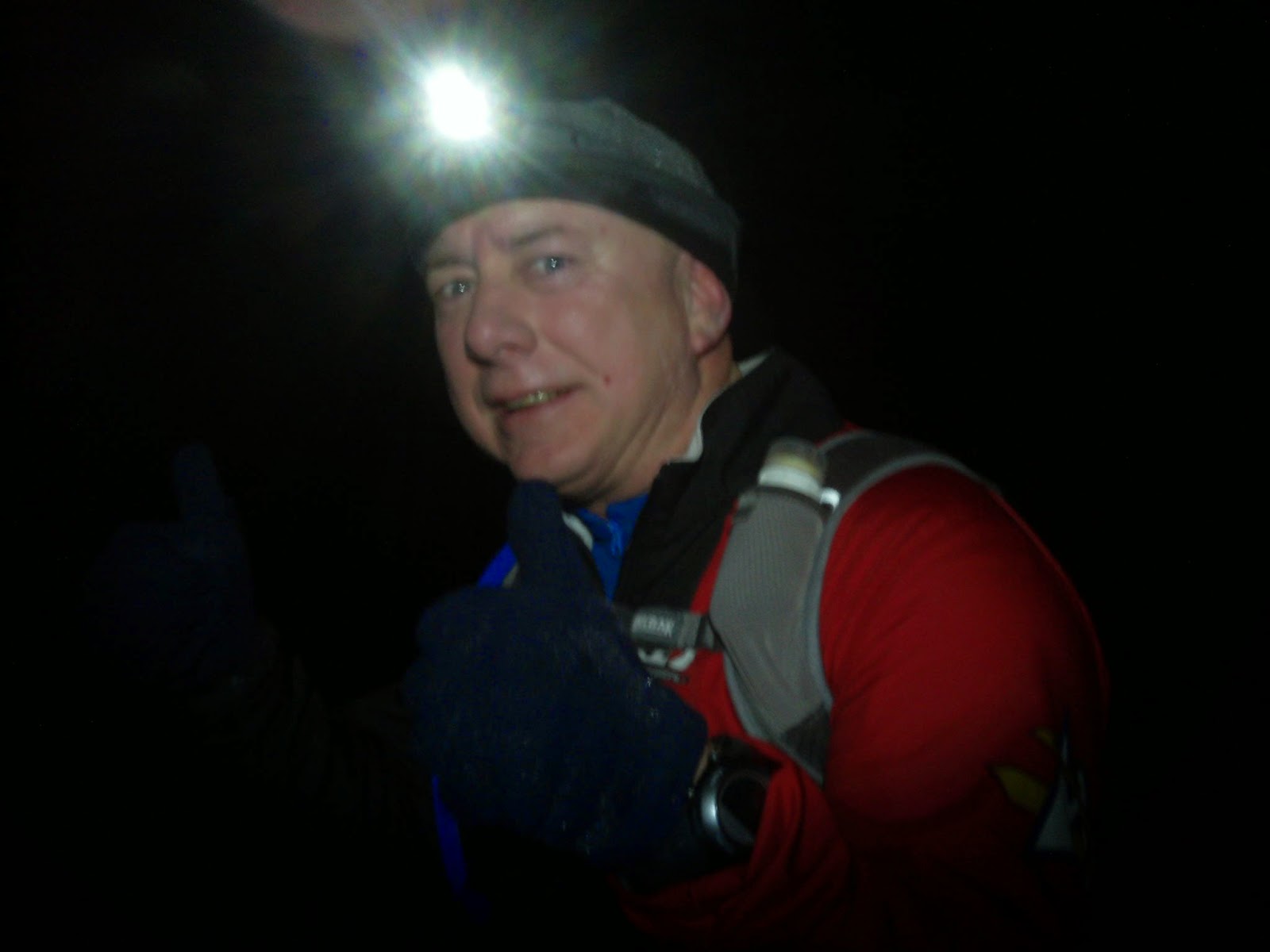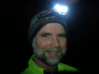 Unfortunately I tripped over a root on the return trip from Comox Lake, totally flipping onto my back. The hydration pack cushioned the blow, but spilt most of its contents. My headlamp went flying off into the undergrowth. I'm sure Louis thought my trip was amusing, though I didn't hear him laughing. He found my headlamp and helped me to reseal the hydration pack, which was now soaked. There was still some drink left for the remains of the run, but not much. The biggest problem was the wetness on my running tights. That caused my legs to freeze up, and my running pace slowed to a crawl.
