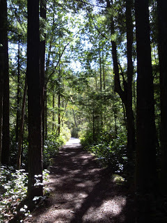 We took turns leading on the trail, as it wound its way through a fir tree forest to the Comox Lake dam. While passing through this we noticed a temperature difference, that it was several degrees warmer in the thick woods, even though we were at a higher elevation.