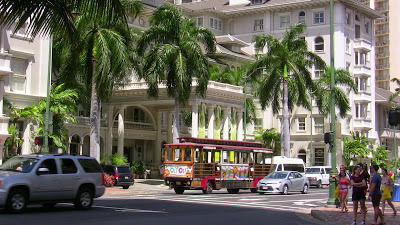 Another route around the same distance leads from Waikiki Beach east to a trail around the perimeter fence of the golf course and then back along a palm tree lined river channel utilized by the rowing community.
