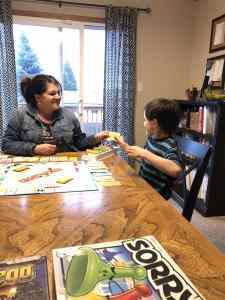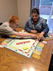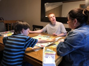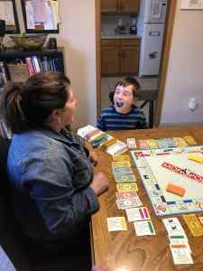 Having a 15-year-old special needs son and a 9-year-old typical child created a unique challenge in connecting with them in this way. I found that adaptability was key. I had to get over my need to play by the rules and to be flexible enough to make up some rules as we went. I somewhat tailored the game to each boy, and they were both on board and engaged. I randomly handed out Monopoly real estate cards, and of course, whoever landed on the property had to pay rent, an easy amount for each of them to remember.