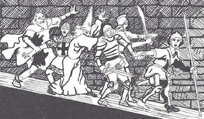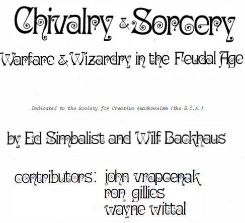 I'd like to offer my thanks to Rob Conley, who pointed out that the title page of the first edition of FGU's Chivalry & Sorcery includes a dedication by the authors to the Society for Creative Anachronism (S.C.A.). The role of the SCA in the history of fantasy fandom (and, by extension, roleplaying games) is still underappreciated, I think. Since I've never been a member or attended any of the Society's events (though my college roommate went to Pennsic every summer), this is a topic about which I know very little. I'd love to know more about it, though, especially as it relates to the influence it may have had over the early days of the hobby.