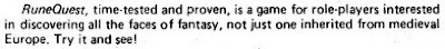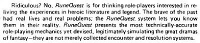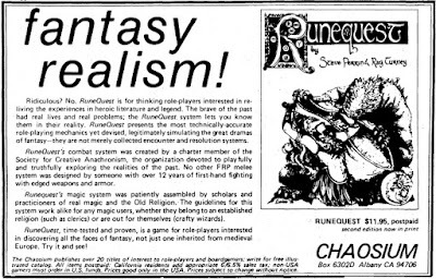 I love looking at old advertisements of all kinds, but especially for roleplaying games. Here's a great one for RuneQuest, which appeared in issue #40 of Dragon (August 1980).
