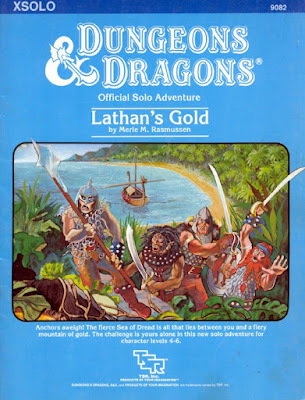 One of the better examples of TSR's forays into this market is 1984's Lathan's Gold, written by Merle M. Rasmussen. Rasmussen is perhaps best known for having designed Top Secret, but it's worth noting that, in the very same year as Lathan's Gold, he also penned Midnight on Dagger Alley, another solo adventure, albeit employing a rather different approach. In fact, Lathan's Gold evinces a rather different approach in a number of areas, which might explain why I think much more highly of this solitaire module than I do of others of its kind, as I'll explain.