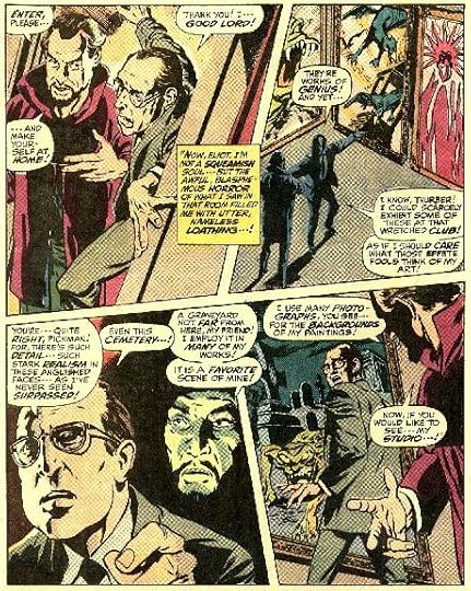 The first difference is the least consequential. Rather than being set in the 1920s, it's set in the early 1970s – the present day of the comic. That has few, if any, repercussions for the story itself beyond esthetic ones. The second is the appearance of the creature that Pickman paints. You can see what it looks like on the cover illustration above. Lovecraft had described the creature as vaguely "canine" in appearance; the creature in the comic is nothing like that. Whether that matters greatly is a matter of taste, I suppose, though I personally prefer the traditional appearance of Pickman's model, particularly in light of Pickman's subequent reappearance in The Dream-Quest of Unknown Kadath.