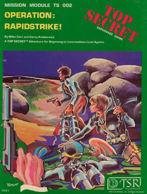 Like many referees, though, I sometimes appreciated having someone else do the heavy lifting for me, which is where pre-made adventures like Operation: Rapidstrike! came in. Written by Mike Carr (of In Search of the Unknown fame) and Corey Koebernick (husband of the Jean Wells) and published in 1980, Rapidstrike! is the first adventure module sold separately from the Top Secret boxed set. Consequently, I was quite keen to pick it up after its release, hoping that it would make a nice change of pace from my own "original" scenarios.