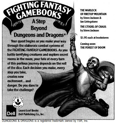 Ian Livingstone's editorial references an unnamed survey of unit sales of RPGs in the USA. According to this survey, the ten top selling games are, in order: D&D, AD&D, Traveller, The Fantasy Trip, Top Secret, Chivalry & Sorcery, Tunnels & Trolls, RuneQuest, Space Opera, and Arduin Grimoire. Quite the list, isn't it? I'm not at all surprised to see both D&D and AD&D there; the same goes for Traveller. With the exception RuneQuest and perhaps Tunnels & Trolls, I wouldn't have expected any of the others to be on the list at all, never mind in the top ten.