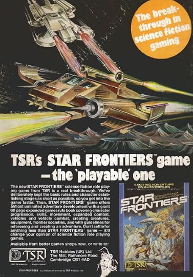Most interesting of all, at least to me, is that the advertisement emphasizes the supposed playability of Star Frontiers over its competitors in the SF RPG market. At the time this ad appeared (1982), Traveller was likely the most popular and successful science fiction roleplaying game on the market, followed by Space Opera. I can certainly believe that Space Opera was widely seen as complex, but was Traveller viewed in the same way? My no doubt rose-colored memories don't include that perception at all, but that doesn't say much. Even given the sorts of hyperbole to which advertising is prone, I can't help but wonder about the claim that Star Frontiers "will change your opinion of science fiction role playing games."