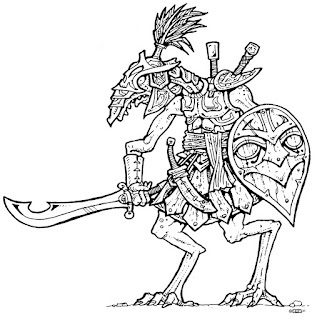 Of course, the bandits are no ordinary highwaymen but rather a coalition of evil men and monsters assembled by Sakatha, the titular lizard king. Sakatha, we learn, died more than two centuries ago, slain, like all his kind, by the ancestors of the people of Eor. Dying on the battlefield, he begged whatever powers that might hear him to have his revenge. Sakatha then rose from the dead as a vampire and has slowly been building up his power base so that he could avenge himself and his people upon Eor. (I feel like I should add that, in addition to being a vampire, Sakatha is also a 9th-level magic-user, so he's quite powerful.)