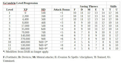 With sufficient room, Ga’andrin can leap up to 10’ forward, granting a +1 bonus to the first attack roll after the leap. If armed with an impaling weapon, the attack counts as a charge and deals double damage on a successful hit.