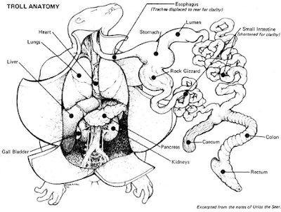 Obviously, everyone draws the line of what constitutes "undermining" fantasy in a different place. But I nevertheless can't help but feel that the tendency toward describing fantastical beings by recourse to rationalistic, scientific categories is an error – an error not just in applying the principle of coherent worldbuilding that undergirds Gygaxian Naturalism but also in understanding fantasy itself. Once upon a time, science fiction was considered a species of the wider genre of a fantasy. SF took place in an imaginary world, as all fantasies do, but one whose imaginary elements were theoretically explicable by recourse to scientific axioms. The anatomical drawings above seem to be tentative examples of applying science fictional principles to fantasy.