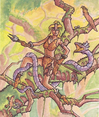One of the best things about re-reading gaming magazines from the early days of the hobby is finding illustrations by well known artists that you'd never seen before. A good case in point is Erol Otus, who's probably most remembered for his work on the 1981 Basic and Expert sets (especially their iconic covers). During his tenure at TSR, he also did a number of pieces – many of them in color – that appeared in the pages of Dragon, such as the one below from issue #43 (November 1980). The illustration accompanied a write-up for Amazons written by Roger E. Moore.