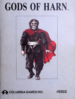Of all the Hârn products I've bought (and never used) over the years, perhaps my favorite is Gods of Hárn. Originally published in 1985, the book is an overview of the ten gods of the setting's pantheon, along with information about the religions that worship them. For me, this is the most important part of what makes Gods of Hârn so special. There have been plenty of RPG books published about deities and divine beings, but few of them provide much in the way of useful information about the structure and activities of their mortal worshipers. Cults of Prax comes to mind, but, even there, the focus is more on the mythological role of the various gods of Glorantha than on the faiths of their followers.Each god in Gods of Hârn receives a description of his or her personality and role in the pantheon, but more detail is heaped on their church. The theological and social missions of the churches is discussed, along with information about their holy days, symbols, history, and clerical organization. Each of these categories is fleshed out in sufficient detail that both the player and referee would find them useful in play. Though there's plenty of detail in Gods of Hârn, the book doesn't luxuriate in detail for its own sake; nearly everything here is presented with the goal of enhancing play, which is particularly useful for players of priests or zealous devotees of a particular god. As a fan of Tékumel, believe me when I say that I adore setting detail. At the same time, I also recognize that there can be such as a thing as too much detail. I believe that Gods of Hârn strikes a good balance between leaving everything up to the referee's imagination and overloading him with needless minutiae.