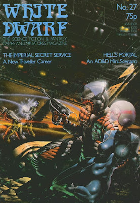 Issue #27 of White Dwarf (October/November 1981) features a science fictional cover by Allan Craddock, an artist who'd later do work on the Fighting Fantasy series. Ian Livingstone's editorial notes that 1982 "should be the year of monthly WD," thanks in no small part to the large number of submissions made to the magazine in answer to last month's appeal for them. The advent of monthly White Dwarf coincides precisely with my own awareness of the periodical, so I look forward to re-reading those issues with which I have contemporary acquaintance.