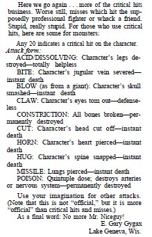 From a purely personal perspective, I can't quite recall when I first encountered the concept of critical hits, but I suspect it was quite early in my introduction to the hobby. By the early '80s, critical hits were one of those rules that everyone knew about and many used, even without being able to point to a section of D&D's actual rules that supported them. For many years, I carried around a photocopy of the critical hit tables from issue #39 (July 1980) and occasionally made use of them. I've never had any really strong feelings for or against the concept, which is why I find Gygax's vehement denunciation of them so odd.