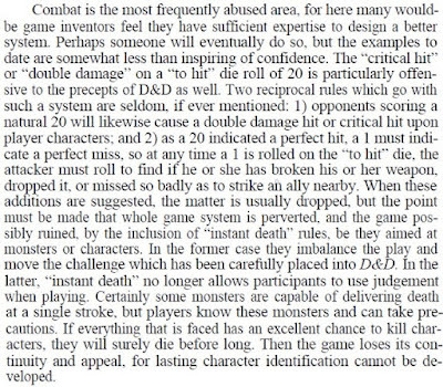 Alternatively, it's possible that Gygax's condemnation of critical hits was a narrow one. He calls them "particularly offensive to the precepts of D&D," not "to the precepts of roleplaying games." He may simply have felt that Dungeons & Dragons was designed with a particular type of experience in mind and that critical hits ran counter to that design. Thus, the presence of critical hits in EPT was of no concern to him, since his opinion was solely concerned with D&D.