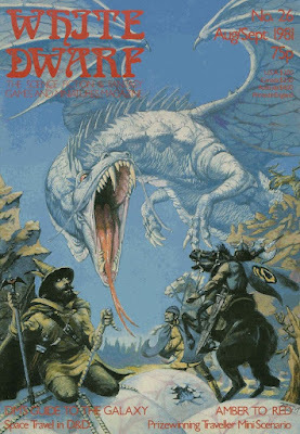 Issue #26 of White Dwarf (August/September 1981) features a cover by Ian McCaig, an artist well known for his contributions to movies and album covers. Ian Livingstone's editorial floats the idea of the White Dwarf's becoming a monthly periodical but also expresses concern that doing so might affect its overall quality. To ensure this doesn't happen, he needs more regular contributors, particularly for games like D&D, Traveller, and RuneQuest (three games I strongly associate with WD, particularly the latter two). It will be interesting, from a historical point of view, to see how soon his call for new writers has any effect on the magazine's content.