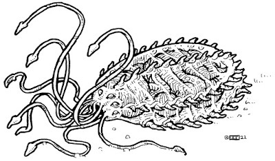 AC 7 [12], HD 5+1** (23hp), Att 8 × tentacles (1d3), 1 × bite (1d3 + blood drain) THAC0 16 [+3], MV 120’ (40’), SV D12 V13 P14 B15 S16 (2), ML 9, XP 575, NA 1d4 (1d4), TT B
