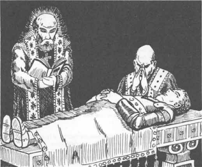 The Cleric simply points his finger, utters the incantation, and the dead person is raised. This spell works with men, elves, and dwarves only. For each level the Cleric has progressed beyond the 8th, the time limit for resurrection extends another four days. Thus, an 8th level Cleric can raise a body dead up to four days, a 9th level Cleric can raise a body dead up to eight days, and so on. Naturally, if the character's Constitution was weak, the spell will not bring him back to life. In any event raised characters must spend two game weeks time recuperating from the ordeal.