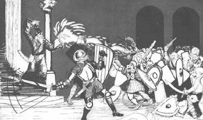 As one might expect of a Greek-themed RPG, Heroes of Olympus involves lots of maritime travel between the lands of Greece and Asia Minor and the myriad islands of the region. Having a galley, as my character does, is thus a huge benefit, since it makes traveling from place to place easier. The general "time period" of the game is the immediate aftermath of the Trojan War, with the heroes doing great deeds during this tumultuous era. Many of those deeds involve fighting, which explains why the game includes three different combat systems, one of which covers naval battles. The other two cover duels between individuals and battles between heroes and "normal" men. These systems involve the allocation of points between attack, defense, initiative, and trickery (special maneuvers). It took me quite a while to wrap my head around the way these systems work, but, once I did, things ran more smoothly. They're still a little clunky and even tedious at times, especially when compared to simpler systems like those in D&D, but there's nevertheless a certain fun to be had in the way they handle battles.