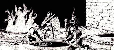 And then there are the myconids, for which I have an inordinate fondness. There's just something about mushrooms and fungi generally that I not only find weirdly appealing but that screams "fantasy!" to me. I suppose my boyhood reading of Lewis Carroll played a role in this peculiar fixation of mine. Regardless, I love the myconids, who are not wholly indifferent to the characters' plight. Indeed, if they agree to perform a service to the myconid king, it will reveal to them an easier means of escaping the dungeons. I have always liked the inclusion of neutral factions in dungeons and Schick does a good job, I think, of showing the potential inherent in such encounters.