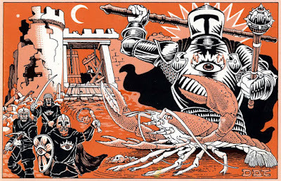 "Treasure Chest" presents fifteen new D&D spells submitted by a variety of authors, including such notables as Roger E. Moore and Mark Galeotti. "Fiend Factory" does something very interesting. Instead of simply presenting seven new D&D monsters, they're all contextualized within a wilderness area known as "One-Eye Canyon." It's quite clever in my opinion and made me much more interested in the new monsters than I have been in previous installments of "Fiend Factory."