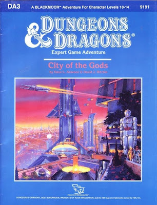 Even so, I happily purchased modules DA1 and DA2, both of which offered up some additional insights into Blackmoor as a setting. One of the things that both these modules made clear was that Arneson was not at all bothered by the inclusion of science fictional elements in his fantasy setting – quite the contrary! So, when the third module in the series, City of the Gods, was released in 1987, I was very interested. Based on its cover illustration by Doug Chaffee alone, it was clear that this one would feature even more explicitly sci-fi material and that intrigued me greatly, despite my ambivalence toward this at the time.