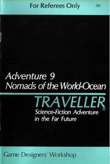Another fine effort by the Keith Brothers, Nomads of the World-Ocean follows a well-worn pattern for both Traveller adventures generally and the works of J. Andrew and William H. Keith, namely the dubious activities of interstellar corporations on worlds in or near the Third Imperium. In this case, the world in question is Bellerophon, whose surface, as the title suggests, is covered entirely by water. That alone sets this adventure apart; there's lots of excellent detail about the planet, its ecosystem, and its native population, all of which really set the scene for the players. The local inhabitants are Turkish-descended people who dwell on immense seagoing vessels and travel across Bellerophon's oceans in search of its largest native lifeform, the vaguely whale-like daghadasi, which they hunt. Recently, it was discovered these creatures are also the source of a biochemical that might be useful in the creation of life extension drugs, hence the interest of corporate agents. Nomads is a rich, complicated adventure replete with not only great science fictional concepts, but also food for thought about economics, colonialism, environmentalism, and more – superb stuff.