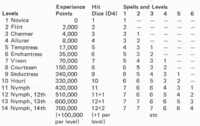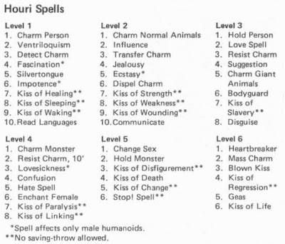 Next up is Brian Asbury's "The Houri Character Class," an alternate female-only magic-user sub-class that relies on charm and seduction. Here's the class's advancement chart, followed by its spell list.